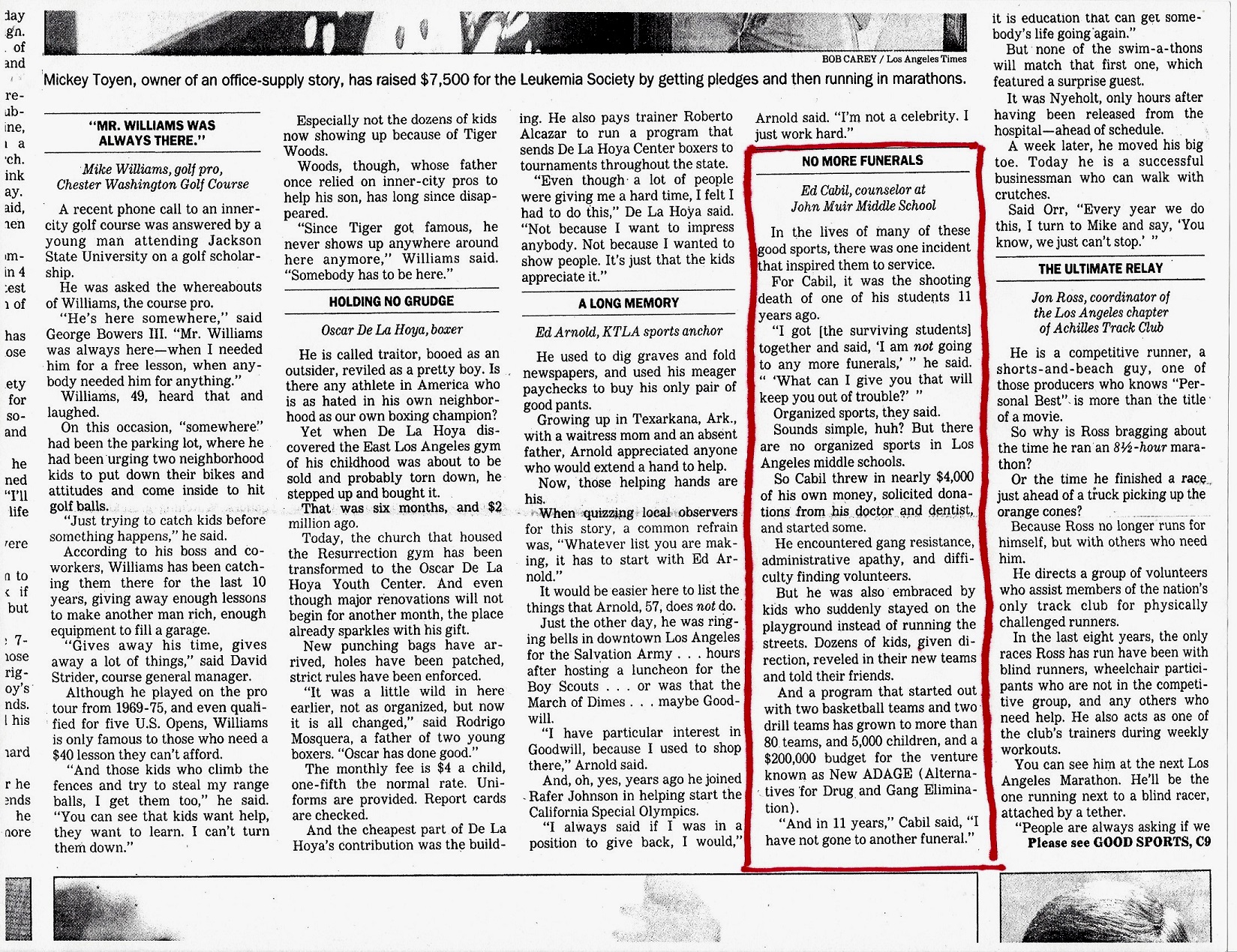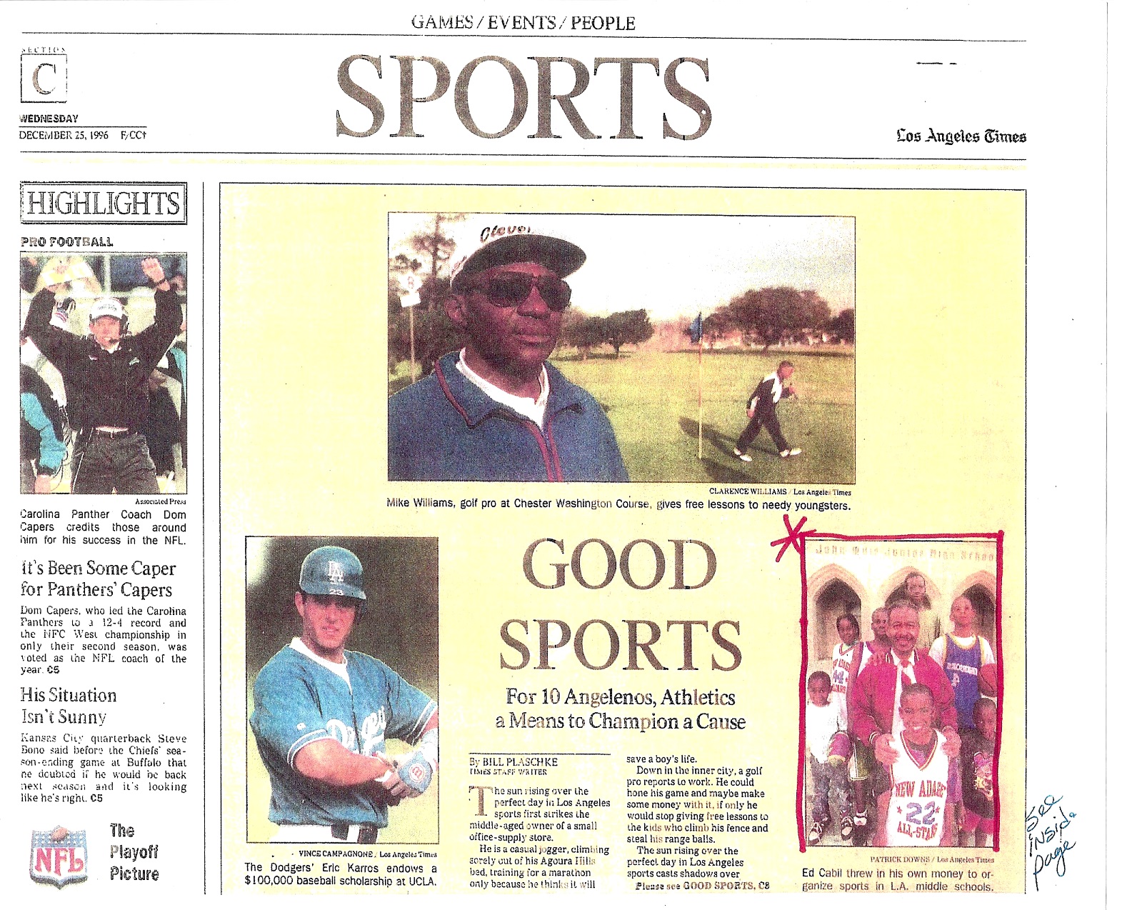Looking back over the sixteen consecutive years of service to South Central Los Angeles, we were proud to learn of former New ADAGE student participants who went on the great accomplishments. We know of Arthur Lee, the Stanford star basketball player (a John Muir graduate) who led the Cardinals to the NCAA Final Four as a junior and to the final sixteen as a senior. We know of Charise Sampson, (a Bret Harte grad) who is a WBA player with Seattle. We know of Kevin Ollie (an Audubon grad) who plays for the Philadelphia 76’s as a back-up guard to Allen Ivanson, now head coach at Connecticut with a National Championship under his belt. We also know of Kobie Connor (a Muir grad) who is a Yale Law grad working at Fox Entertainment. We also know of Latanya Hadnot, (Muir grad) a former basketball player who just recently was promoted from her works as Deputy District Attorney for twenty-one years to L.A. County Commissioner. However, we do not know of the thousands of others who may be general to highly productive members of society. We do know this fact so far – NOT ONE New ADAGE participant has been killed since the program began its mission in 1986. (See L.A. Times article below – December 25, 1995)